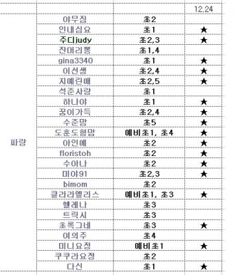 ¹Ý À̸§ Ãâ¼® üũ ³¯Â¥ 12¿ù24ÀÏ ÃÊ·Ï 1 eveya ÁÖ¾ó ¿© ÃÊ1 ¡Ú 2 ¿·Áýµµ¼°ü Sarah ¿© ÃÊ3 ¡¡ 3 µµÇöºó¼¸¾ Bini ³² ÃÊ2 ¡Ú Hyuni ³² ÃÊ3 ¡Ú 4 ¼¿¬¿¹¿ø¸¾ ·ÎÁî ¿© ÃÊ2 ¡Ú 5 Ä¿ÇÇÇÑÀÜÄÝ Á¶ÀÌ ¿© ÃÊ2 ¡Ú 6 µ¿Àº¸¾ Gabie ¿© ÃÊ2 ¡¡ 7 °í²¿¹Ì Daniel ³² ÃÊ1 ¡¡ 8 ¼öÁ¤¾ö¸¶ Luna ¿© ÃÊ1 ¡Ú 9 upscale µ¥À̺ø ³² ÃÊ1 ¡Ú 10 °íµµ Fern ¿© ÃÊ2 ¡Ú 11 ´ÙµÕÀ̾ö¸¶ ¹ÎÈ« ¿© ¿¹ºñÃÊ1 ¡Ú 12 Å丶Åä22 David ³² ÃÊ2 ¡Ú 13 ¾ö¸¶´Â¿µ¾î½Ü Sue Ellen ¿© ÃÊ1 ¡¡ 14 ºÒÀ×°É Amy ¿© ÃÊ3 ¡Ú ¸®µð¾Æ ¿© ÃÊ5 ¡Ú 15 Çູ¸¶¹Ì Amy ¿© ÃÊ3 ¡Ú 16 Á¦ÀÌÁ¦À̸¶¹Ì ÇØ¸® ³² ÃÊ2 ¡Ú 17 ÃÊ·Õº° Sally ¿© ÃÊ1 ¡Ú 18 empty Sarah ¿© ÃÊ2 ¡¡ 19 Grace¸¾ Kate ¿© ÃÊ3 ¡Ú 20 rose04lily Roy ³² ÃÊ3 ¡Ú 21 º¸¸®¾Ë Kevin ³² ÃÊ3 ¡Ú 22 elove Danny ³² ÃÊ2 ¡¡ 23 ¾ÈÁ©¸®³ª Yuni ³² ÃÊ2 ¡¡ 24 °¡°¸¾ Jessica ¿© ÃÊ2 ¡¡ 25 º§ºª Anna ¿© ÃÊ2 ¡ÚÆÄ¶û¹Ý Ãâýǥ ¿Ã¸±²²¿ä..