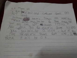 The first reason why I think video(computer)games are not good is because it is sometimes violent. My brother likes to play a game called 'League of Legend'. I was watching the game, and it was very violent. The team had to kill the other team. Also, there was a space that we canchat with each other. The other team doesn't know who else is playing, so they just write bad words to others.I think because of that game, my brother is more violent and uses more bad words.