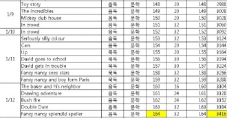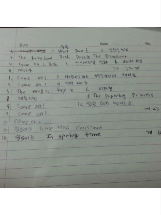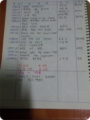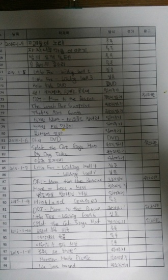 ÇÑ ¿µ ³¯Â¥ Ã¥Á¦¸ñ ¹æ½Ä ºÐ¾ß page 40 ¡¡ 1.9(±Ý) ¶Ë ¸ÔÀº »ç°ú ȯ°æ 48 ¡¡ 79 Tornado Áýµè Sunshine R.(level5) 24 ¡¡ DVD: Chloe's closet 25) Hairy tale 26) Raiders of the lost egg ¡¡ 1.10(Åä) DVD: Chloe's closet 27) Best in snow 28) Leave it to the beavers ¡¡ 77-R 1.11(ÀÏ) Splat the cat-sings flat Áýµè I can read(level1) 32 41 ¡¡ 1.12(¿ù) ±¸··µ¢µ¢ ½Å¼±ºñ Àü·¡ 34 42 ¡¡ ±¸··µ¢µ¢ »õ ¼±ºñ Àü·¡ 35 43 ¡¡ ¶¥¿¡ ¹¯Èù ±Ýµ¢¾î¸® âÀÛ 30 ¡¡ 80 Owl babies Áýµè picture book 22 ¡¡ 77-R Splat the cat-sings flat Áýµè I can read(level1) 32 ¡¡ DVD: Hurray for Huckle! 1) The big apple mystery 2) The missing pickle car mystery ´©Àû ÇѱÛÃ¥ 3540 ¿µ¾îÃ¥ 1859