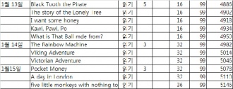 ³¯Â¥ Ã¥Á¦¸ñ ¹æ½Ä ºÐ¾ß ½Ã¸®Áî ÇÕ°è(´©°è) 13ÀÏ(È) The Flag Áýµè, À½µ¶ »çȸ JY À̸ÓÀü¸®´õ½º Level 2/B ¡¡ ¡¡ The Water Fight Áýµè, À½µ¶ âÀÛ ORT 2 ¡¡ ¡¡ New Trees Áýµè, À½µ¶ âÀÛ ORT 2 ¡¡ ¡¡ The Little Dragon Áýµè, À½µ¶ âÀÛ ORT 2 ¡¡ ¡¡ The Band Áýµè, À½µ¶ âÀÛ ORT 2 ¡¡ ¡¡ A Present for Mum Áýµè, À½µ¶ âÀÛ ORT 2 ¡¡ ¡¡ Sports Day Áýµè âÀÛ ÆäÆÄÇÇ±× ¡¡ ¡¡ Sports Day À½µ¶ âÀÛ RIY 2 ¡¡ ¡¡ Topsy and Tim At the Farm À½µ¶ âÀÛ RIY 1 ¡¡ ¡¡ Am I a ?? ? Áýµè, À½µ¶ ¾ð¾î JFR 23¹ø ¡¡ ¡¡ Do I Go to a ?? ? Áýµè, À½µ¶ ¾ð¾î JFR 35¹ø ¡¡ ¡¡ Counting Pencils Áýµè, À½µ¶ ¼öÇÐ JY À̸ÓÀü¸®´õ½º Level 1/A ¡¡ ¡¡ Our Tea Party Áýµè, À½µ¶ âÀÛ Çï·Î¸®´õ 1 ¡¡ ¡¡ CAT TRAPS Áýµè, À½µ¶ âÀÛ ½ºÅÜÀÎÅõ¸®µù 1 ¡¡ ¡¡ Cat and Dog Áýµè, À½µ¶ ¾ð¾î ·±Åõ¸®µå 2 ¡¡ ¡¡ Spiders, Spiders Everywhere! Áýµè, À½µ¶ ¼öÇÐ ·±Åõ¸®µå 2 ¡¡ ¡¡ My Bike Ride Áýµè, À½µ¶ ¾ð¾î Äݸ°½ººòĹ ·¹µå A ¡¡ ¡¡ Animmal Coats Áýµè, À½µ¶ ¾ð¾î Äݸ°½ººòĹ ·¹µå A ¡¡ ¡¡ IN-CROWD Áýµè âÀÛ º£·»½ºÅ¸Àκ£¾î½º ¡¡ ¡¡ MESSY DAY À½µ¶ ¾ð¾î NIR-pre ¡¡ ¡¡ HIDE AND SEEK À½µ¶ ¾ð¾î NIR-pre ¡¡ ¡¡ Monkey Tricks À½µ¶ âÀÛ ORT 2 ¡¡ ¡¡ Hey Presto! À½µ¶ âÀÛ ORT 2 ¡¡ ¡¡ Barney Bear Gets Dressed À½µ¶ ¼öÇÐ ·±Åõ¸®µå 1 ¡¡ ¡¡ See How It Grows À½µ¶ °úÇÐ ·±Åõ¸®µå 1 25 (435) 14ÀÏ(¼ö) THE RADISH ROBBER Áýµè âÀÛ RIY 1 ¡¡ ¡¡ Pirate School Áýµè âÀÛ RIY 2 ¡¡ ¡¡ The MIXED-UP MORNING Áýµè, À½µ¶ âÀÛ ¸®Æ²Å©¸®ÅÍ FIRST READERS ·¹º§2 ¡¡ ¡¡ IN-CROWD Áýµè âÀÛ º£·»½ºÅ¸Àκ£¾î½º ¡¡ ¡¡ Snow Day À½µ¶ âÀÛ READY-TO-READ ·¹º§1 ·ÎºóÈú½ºÄð ¡¡ ¡¡ I Shop with My Daddy Áýµè, À½µ¶ âÀÛ Çï·Î¸®´õ 1 ¡¡ ¡¡ New Trainers Áýµè, À½µ¶ âÀÛ ORT 2 ¡¡ ¡¡ The Hole in the Sand Áýµè, À½µ¶ âÀÛ ORT 2 ¡¡ ¡¡ What a Bad Dog! Áýµè, À½µ¶ âÀÛ ORT 2 ¡¡ ¡¡ The Lost Puppy Áýµè, À½µ¶ âÀÛ ORT 2 ¡¡ ¡¡ A Night at the Gallery Áýµè, À½µ¶ ¾ð¾î Äݸ°½ººòĹ ·¹µå A ¡¡ ¡¡ At the Dump Áýµè, À½µ¶ ¾ð¾î Äݸ°½ººòĹ ·¹µå B ¡¡ ¡¡ Safety Counts! Áýµè, À½µ¶ »çȸ ·±Åõ¸®µå 2 ¡¡ ¡¡ Round and Round the Seasons Go Áýµè, À½µ¶ °úÇÐ ·±Åõ¸®µå 2 ¡¡ ¡¡ Going ?? Áýµè, À½µ¶ ¾ð¾î JFR 20¹ø ¡¡ ¡¡ Here Are ?? Áýµè, À½µ¶ ¾ð¾î JFR 14¹ø ¡¡ ¡¡ WISHING WITH PENNIES Áýµè, À½µ¶ »çȸ JY À̸ÓÀü¸®´õ½º Level 2/B ¡¡ ¡¡ I HAVE A COIN Áýµè, À½µ¶ ¼öÇÐ JY À̸ÓÀü¸®´õ½º Level 2/B 18 (453) 15ÀÏ(¸ñ) IN-CROWD Áýµè âÀÛ º£·»½ºÅ¸Àκ£¾î½º ¡¡ ¡¡ At the Pool À½µ¶ âÀÛ ORT 3 ¡¡ ¡¡ What a DIN! À½µ¶ âÀÛ ORT 1+ ¡¡ ¡¡ Sports Day À½µ¶ âÀÛ ÆäÆÄÇÇ±× ¡¡ ¡¡ Gran and the Go-karts À½µ¶ âÀÛ ORT 3 ¡¡ ¡¡ The Cold Day À½µ¶ âÀÛ ORT 3 ¡¡ ¡¡ The Magic Egg Áýµè, À½µ¶ âÀÛ Äݸ°½ººòĹ ·¹µå A ¡¡ ¡¡ The Oak Tree Áýµè, À½µ¶ °úÇÐ Äݸ°½ººòĹ ·¹µå B ¡¡ ¡¡ THE RADISH ROBBER Áýµè âÀÛ RIY 1 ¡¡ ¡¡ Pirate School Áýµè âÀÛ RIY 2 ¡¡ ¡¡ THE LITTLE CHRISTMAS TREE Áýµè, À½µ¶ âÀÛ ¸®Æ²Å©¸®ÅÍ FIRST READERS ·¹º§2 ¡¡ ¡¡ "What Is THAT?" Said the Cat Áýµè, À½µ¶ âÀÛ Çï·Î¸®´õ 1 ¡¡ ¡¡ A Tooth Story Áýµè, À½µ¶ âÀÛ READY-TO-READ ·¹º§1 ·ÎºóÈú½ºÄð ¡¡ ¡¡ The Giraffe Made Her Laugh Áýµè, À½µ¶ ¾ð¾î ·±Åõ¸®µå2 ¡¡ ¡¡ A-Counting We Will Go Áýµè, À½µ¶ ¼öÇÐ ·±Åõ¸®µå2 ¡¡ ¡¡ We Like ?? Áýµè, À½µ¶ ¾ð¾î JFR 34¹ø ¡¡ ¡¡ Am I on a ?? ? Áýµè, À½µ¶ ¾ð¾î JFR 25¹ø ¡¡ ¡¡ I See Cubes Áýµè, À½µ¶ ¼öÇÐ JY À̸ÓÀü¸®´õ½º Level 2/B ¡¡ ¡¡ A Map of My House Áýµè, À½µ¶ »çȸ JY À̸ÓÀü¸®´õ½º Level 3/C ¡¡ ¡¡ The Fizz-buzz Áýµè, À½µ¶ âÀÛ ORT 2 Ç÷ÎÇÇÆÄ´Ð½º ¡¡ ¡¡ Shops Áýµè, À½µ¶ âÀÛ ORT 2 Ç÷ÎÇÇÆÄ´Ð½º ¡¡ ¡¡ Creepy-crawly! Áýµè, À½µ¶ âÀÛ ORT 2 ¡¡ ¡¡ Naughty Children Áýµè, À½µ¶ âÀÛ ORT 2 23 (476)