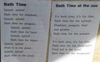 Ã¥¿¡ "bath time"ÀÌ °è¼Ó ¹Ýº¹µÇ¾î Á¦°¡ ¼Õ ¤À¸¸é¼ Á¦´Ï¿¡°Ô Àо¶ó°í ÇÏ´Ï, µ¿¹° ±×¸²º¸°í ¹Ù²ã°¡¸ç Àß Àоú¾î¿ä. °ü·ÃµÈ Ã¥À» ¸î ±Ç ÀоîÁá´Âµ¥ "Goodnight, gorilla"´Â ¾ðÁ¦ ºÁµµ Àç¹ÌÀÖ¾î Çϳ׿ä. ±Ùµ¥, ´ëºÎºÐÀÇ bath time Ã¥ ³»¿ëµéÀÌ ÁÖÀΰøÀÌ Ã³À½¿¡´Â ¸ñ¿åÀ» ½È¾îÇß´Ù°¡ °á±¹¿¡´Â ±âºÐÁÁ°Ô ¸ñ¿åÀ» ÇÑ´Ù´Â ³»¿ëÀ» ´ã°í ÀÖ´Ù´Â °ÍÀ» Àúµµ À̹ø ±âȸ¿¡ ¾Ë¾Ò³×¿ä. ^^