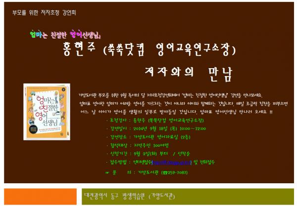* ÃÊû°»ç : È«ÇöÁÖ (¾¦¾¦´åÄÄ ¿µ¾î±³À°¿¬±¸¼ÒÀå) * °¿¬ÀϽà : 2014³â 9¿ù 18ÀÏ (¸ñ) 10:00~12:00 * °¿¬Àå¼Ò : ´ëÀü µ¿±¸ °¡¾çµµ¼°ü ¿µ¾îÀÚ·á½Ç (2Ãþ) * Âü¼®´ë»ó : Áö¿ªÁֹΠ100¿©¸í * ½Åû±â°£ : 9¿ù 2ÀÏ(È)ºÎÅÍ / ¼±Âø¼ø * Á¢¼ö¹æ¹ý : ÀÎÅÍ³Ý Á¢¼ö(http://lll.donggu.go.kr) ¹× ÀüÈÁ¢¼ö ¢Ñ ¹®ÀÇ : °¡¾çµµ¼°ü (¢Ï042-259-7087) |