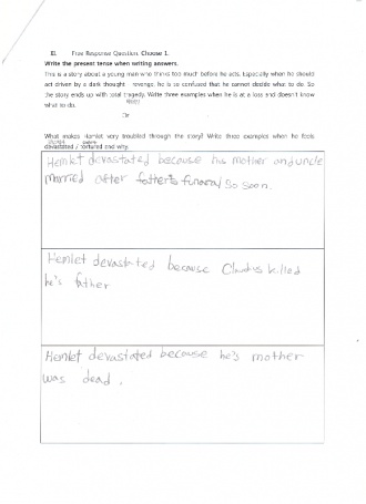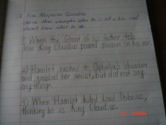 This is a story about a young man who thinks too much before he acts. Especially when he should act driven by a dark thought - revenge, he is so confused that he cannot decide what to do. So the story ends up with total tragedy. Write three examples when he is at a loss and doesn¡¯t know what to do.