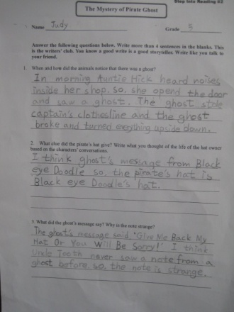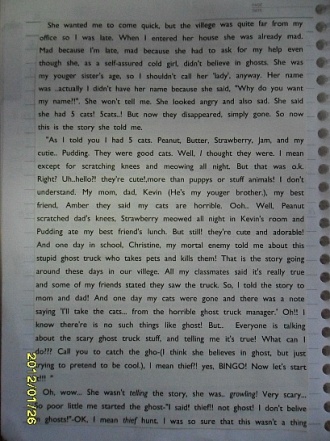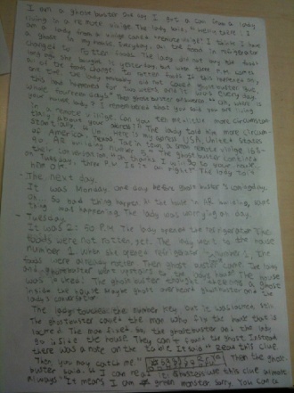 So I went to visit her in the remote village. She said she saw a ghost at her house at the kitchen. So I went to the kitchen and saw nothing. And she said she saw it at night. Oh! the poor lady. After she saw the ghost she couldn't eat anything. So I waited for night at the lady¡¯s house. At last, I saw something moving! I went near and saw a bunch of small things covered in curtain moving! I opened the curtain and saw a tree moving by the wind. That night the woman could eat the dinner safely with me. And also the woman thanked me for guessing out what the ghost¡¯s figure was.