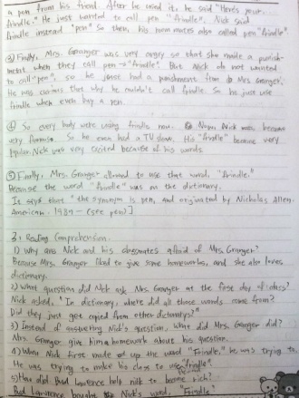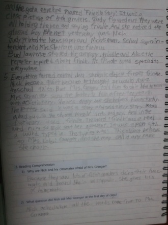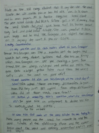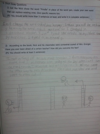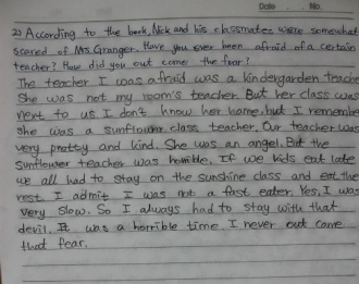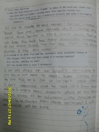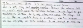 2)Yes. I have been afraid of my teacher. Who? My homeroom teacher, this year. Do you know why I was afraid of her? I have to write question and answer three times if I am wrong in test. Except for semester's middle test and final test. I am afraid because I don't know how many tests I will have in one day. I had 6 tests in one day before!