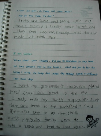 It's nice to meet you all again!Did you all have great Ãß¼®?Even though I could not have a proper Ãß¼®, I did something with other Korean students.We had some Chinese food delivered and had a nice Saturday night.It is really sad for me to miss Ãß¼® and ¼³ in a row because I could not enjoy the only opportunity to meet my relatives and to get »õºªµ·/¿ëµ·. Back to the business, how was the book?This story is really familiar because every child has had hard time learning how to ride a bike and I also had the same trouble when young.It was awesome when Freddy beat Max and won the deal, wasn't it?Enjoy the reading and see you all next week!!Have a great fall!